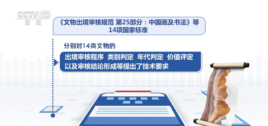 《文物出境審核規範 第25部分:中國畫及書法》等14項國家標準,分別對14類文物的出境審核程序、類別判定、年代判定、價值評定以及審核結論形成等提出了技術要求。