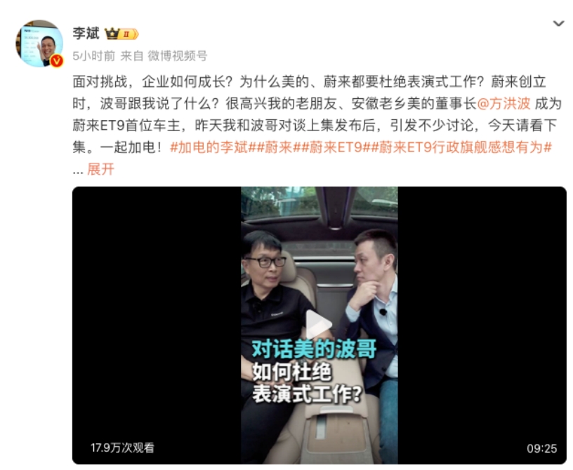 蔚來ET9首車交付引管理熱議 美的方洪波稱"95%的加班都是形式主義"