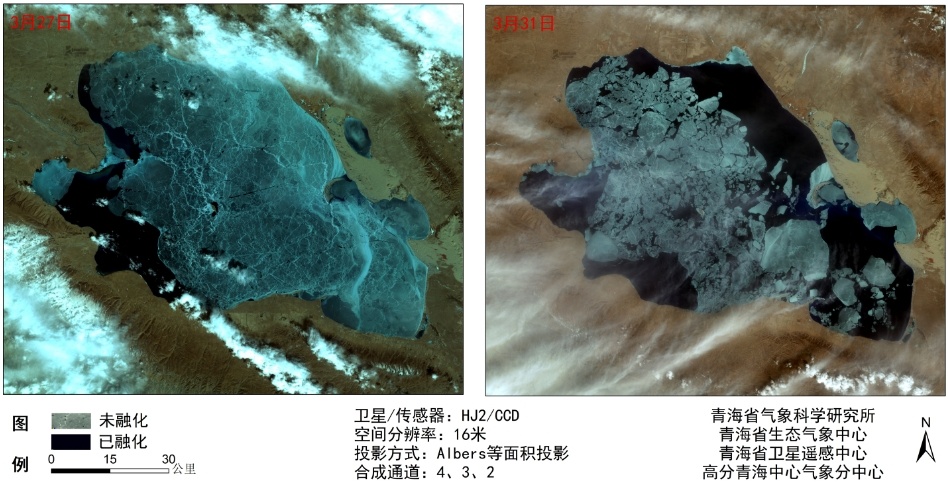 衞星遙感監測顯示,青海湖西南部湖冰融化範圍形成由湖岸向湖中心呈環狀或不規則帶狀分佈的開裂帶。其中,布哈河入湖口、鐵布卡灣以及黑馬河沿岸附近湖冰融化明顯,洱海南部已基本融化。3月31日,青海湖融化面積進一步擴大,東部沿岸湖冰明顯融化,主湖體出現大面積的冰塊和冰裂紋。
