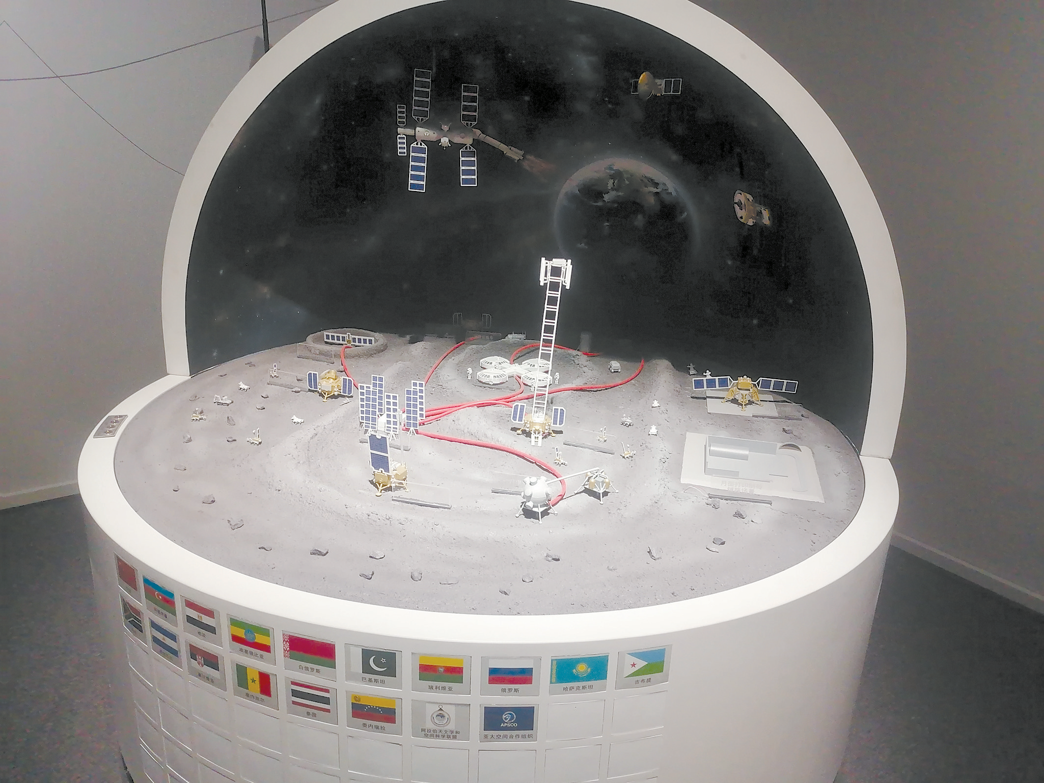 在展覽現場展示的中國計劃在月球上建立的國際月球科研站模型,清晰展現了其基本構成。國際月球科研站是由我國倡議發起、多國參與建設、位於月球表面與月球軌道的綜合科研設施,具備長期自主運行、短期有人蔘與的能力。現場模型顯示,國際月球科研站包括為整個科研站提供能源的核堆與太陽能電站、供航天員生活的月面生存艙、提供氧氣的月壤製氧設備、確保航天員和物資往返的着陸上升器以及保證通信的月面通信塔等基礎設施,還有月基觀測等所需的科研設備。