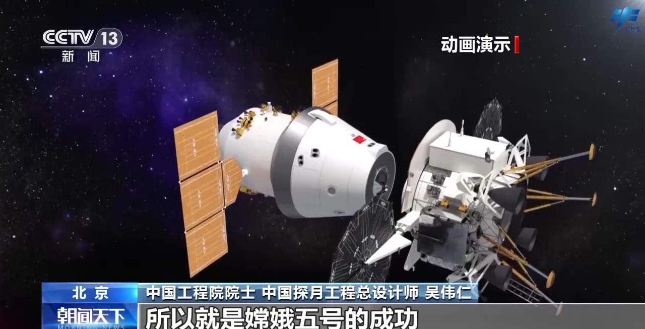 中國工程院院士 中國探月工程總設計師 吳偉仁:當時就想利用嫦娥五號來驗證我們後續載人登月技術,載人登月就是在軌道上交會對接,然後人下去探測,探測完後月面起飛,在軌道上交會對接,然後人再進入返回器,返回器再和軌道器脱離,脱離過後,返回器把人送回地球。所以嫦娥五號的成功,為未來我們載人登月奠定基礎,幾乎把所有的關鍵技術都驗證了一遍。