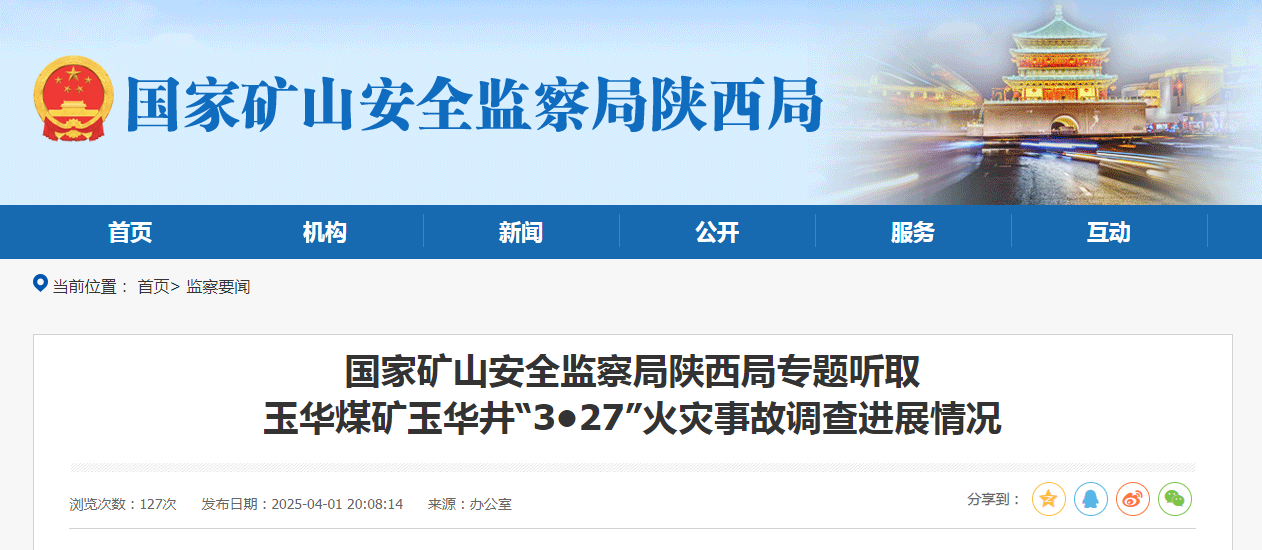 4月1日,國家礦山安全監察局陝西局黨組書記、局長張巍組織召開會議,專題聽取銅川礦業公司玉華煤礦玉華井“3•27”火災事故調查進展情況。