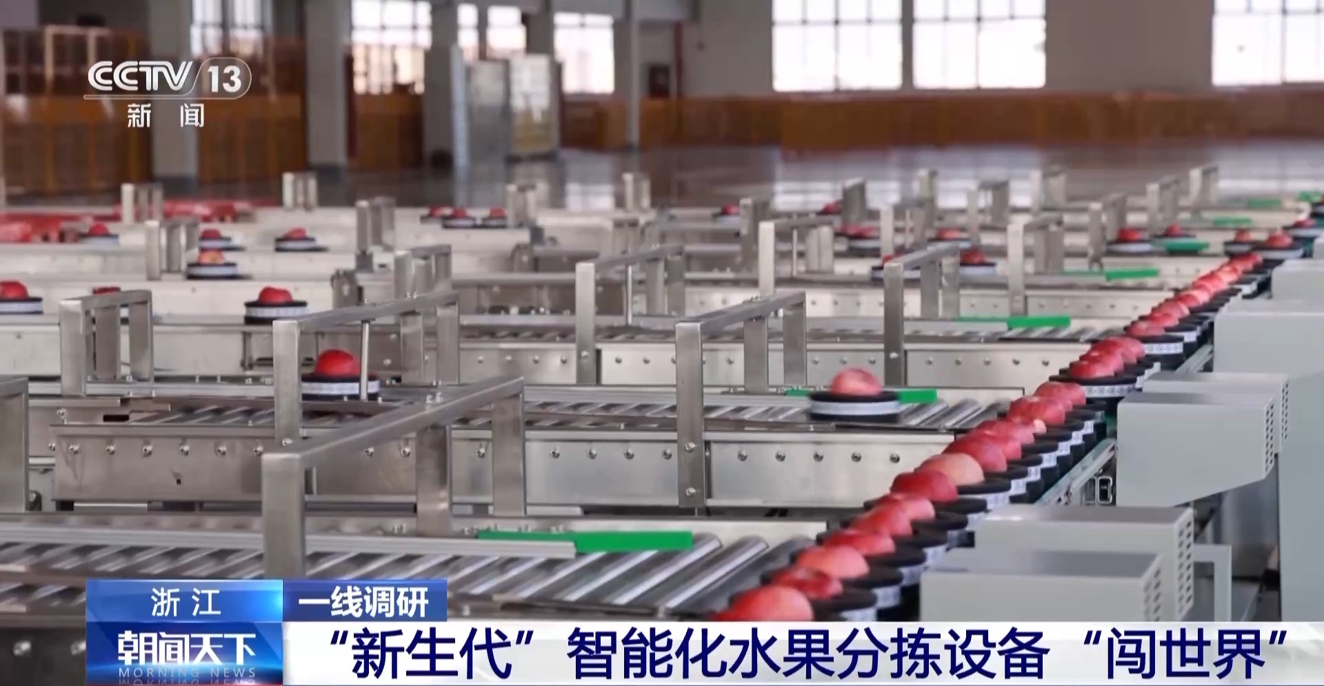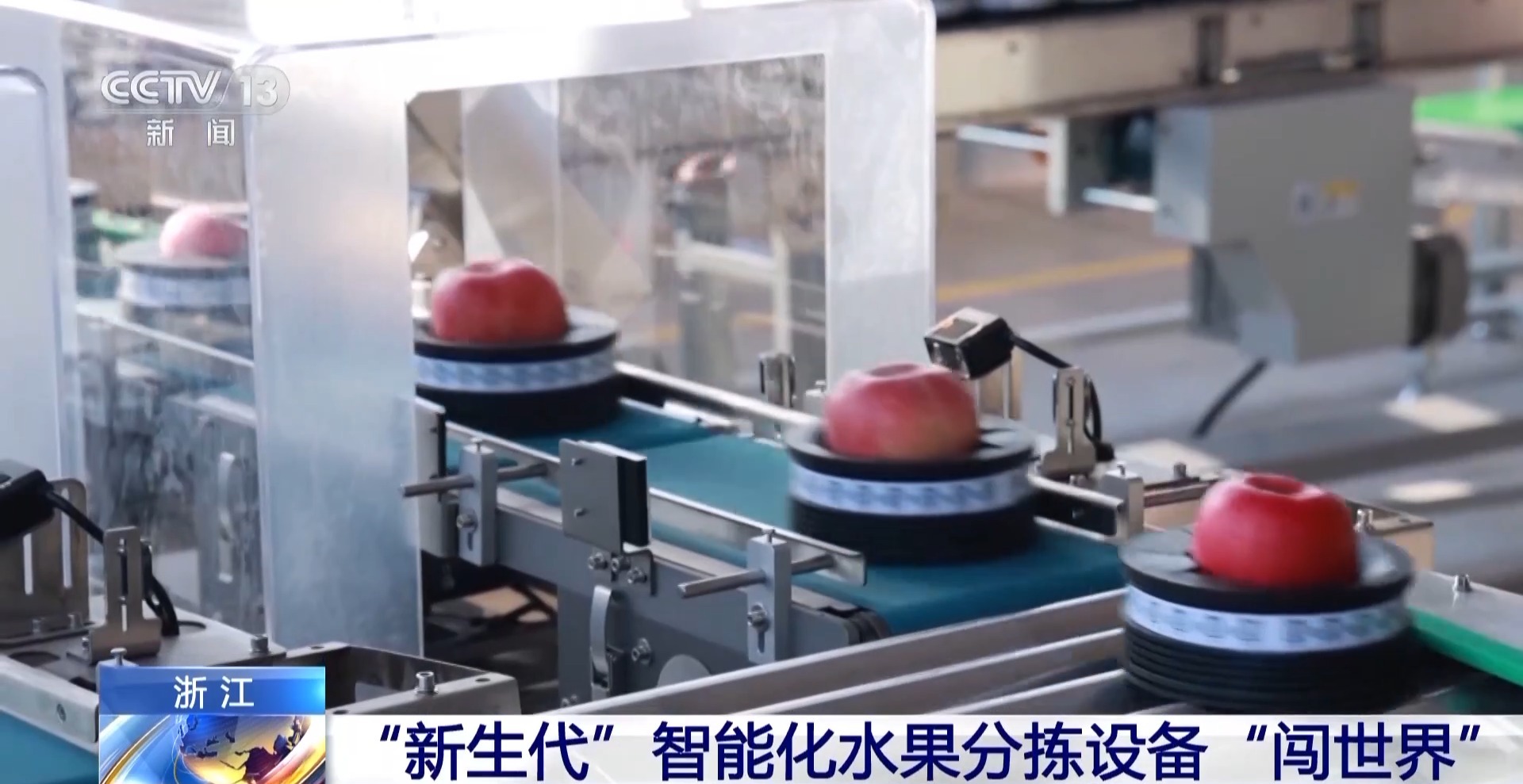 *總枱央視記者 李嘯虎:*在這條智能化水果分揀線上,機器正以每秒6個的速度檢測每個水果的外觀、重量、糖度等數據,並按照不同標準對每個水果進行精準分類,並且系統可以即時顯示這批水果的數據分佈。像這樣的智能化設備每小時可以檢測2萬個水果左右。
