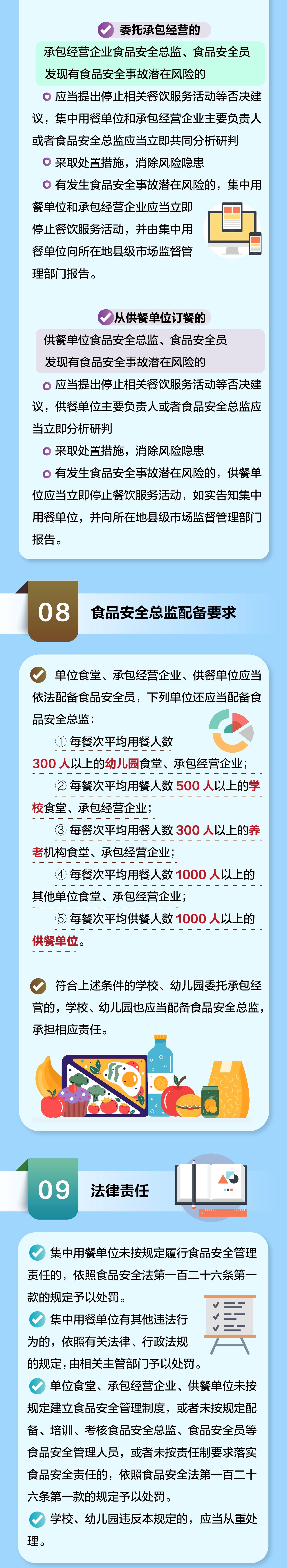 《規定》共27條,對集中用餐單位、單位食堂、承包經營企業、供餐單位,從責任分配、風險防控機制、食品安全管理人員配備和任職要求、法律責任等方面進行了規定。主要內容如下: