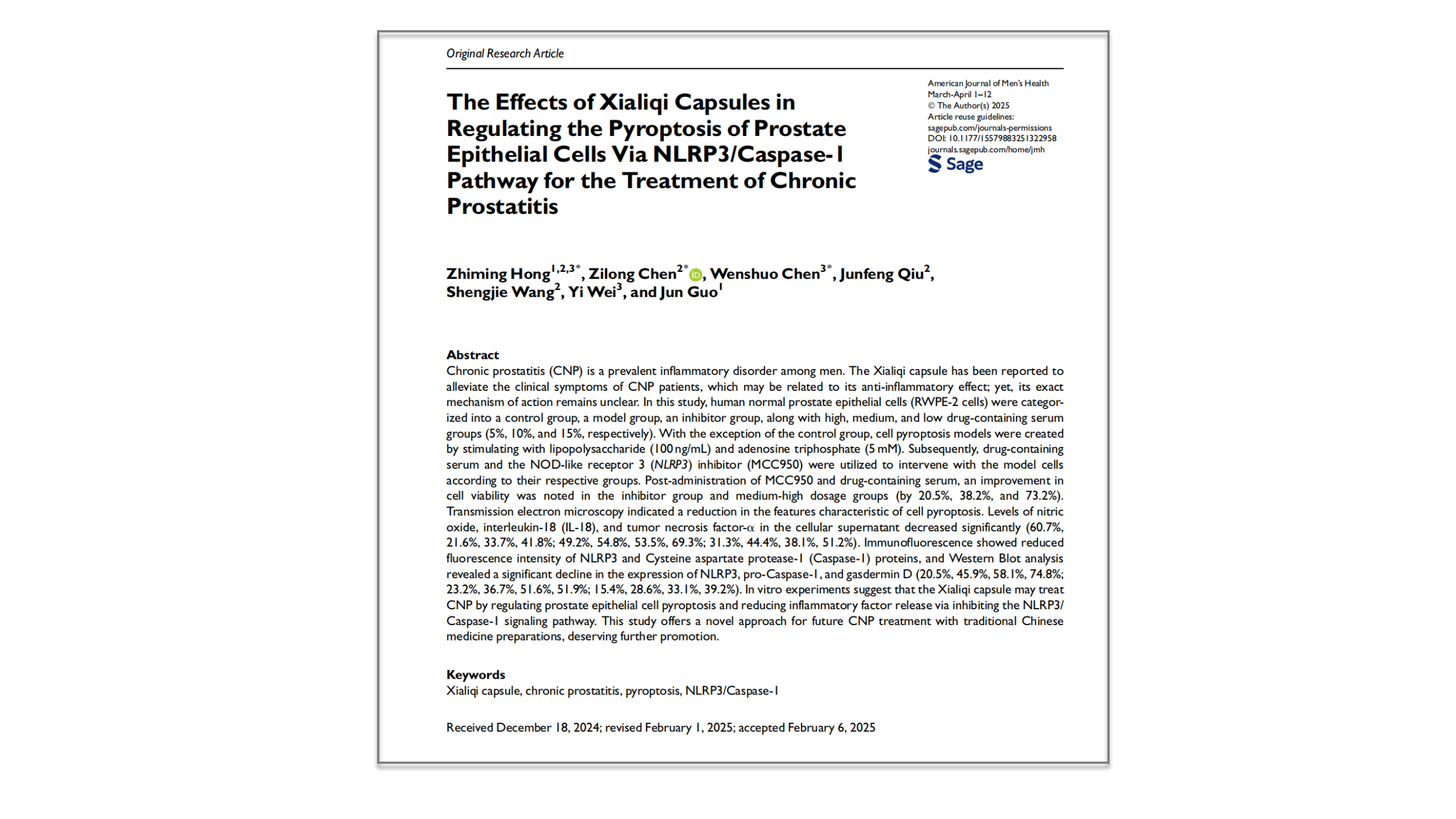 近日,一篇題為《夏荔芪膠囊通過調控NLRP3/Caspase-1通路抑制前列腺上皮細胞焦亡治療慢性前列腺炎的作用機制研究》的研究論文在國際期刊《美國男性健康雜誌》(American Journal of Men’s Health)發表。該論文揭示了夏荔芪膠囊通過調控炎症通路,抑制前列腺炎症和細胞焦亡的科學機制,為慢性前列腺炎患者提供了潛在治療選擇,減少抗生素濫用風險。