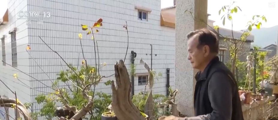 70歲的丁偉洪來自澳門。2024年,他在珠海金灣區三灶鎮木頭衝村租下了一套石頭屋。經過簡單裝修改造後,丁偉洪在這裏養花、種菜,製作根雕,生活非常愜意。