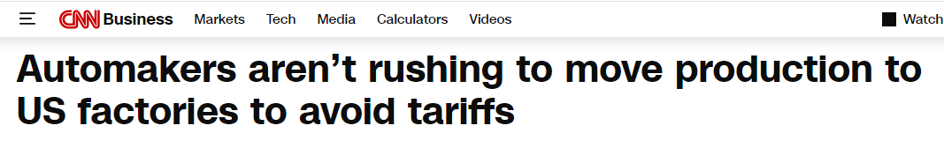美國有線電視新聞網(CNN)的報道則指出,對汽車行業的加税舉措並不會帶來“車企爭相在美建廠”的情況,這一目標很難實現,因為對於車企來説,成本和代價十分沉重。