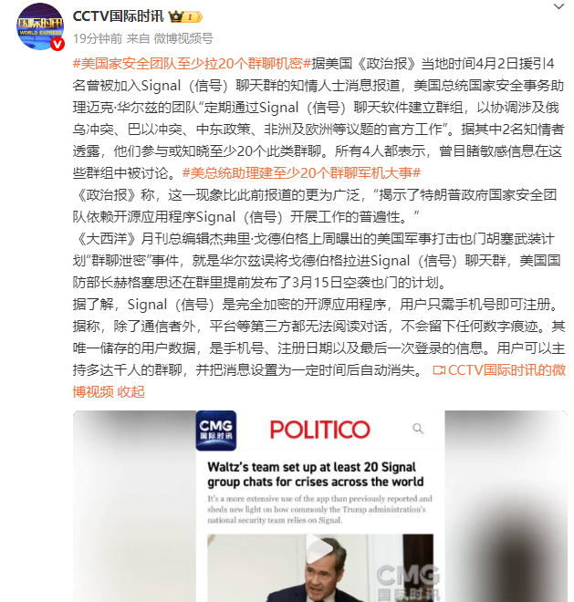 據美國《政治報》當地時間4月2日援引4名曾被加入Signal(信號)聊天羣的知情人士消息報道,美國總統國家安全事務助理邁克·華爾茲的團隊“定期通過Signal(信號)聊天軟件建立羣組,以協調涉及俄烏衝突、巴以衝突、中東政策、非洲及歐洲等議題的官方工作”。據其中2名知情者透露,他們參與或知曉至少20個此類羣聊。所有4人都表示,曾目睹敏感信息在這些羣組中被討論。