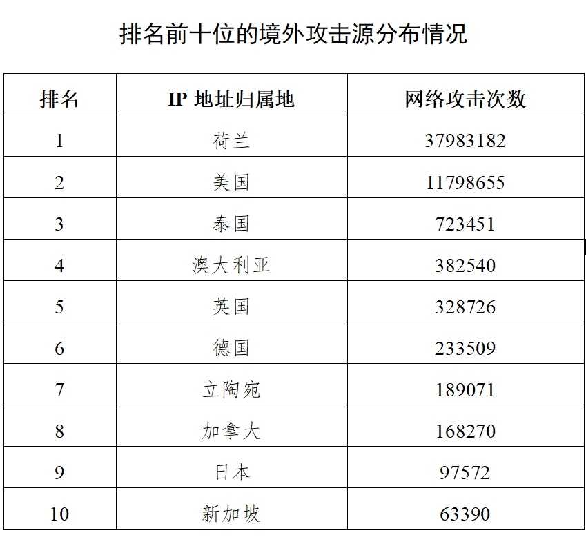 1月31日至2月14日期間,針對黑龍江省內關鍵信息基礎設施實施的網絡攻擊主要源自美國及其盟友國家,其中攻擊次數最多的三個國家分別為荷蘭(3798萬次)、美國(1179萬次)、泰國(72萬次)。澳大利亞、英國、德國、立陶宛、加拿大、日本和新加坡分別位列第四至第十位。