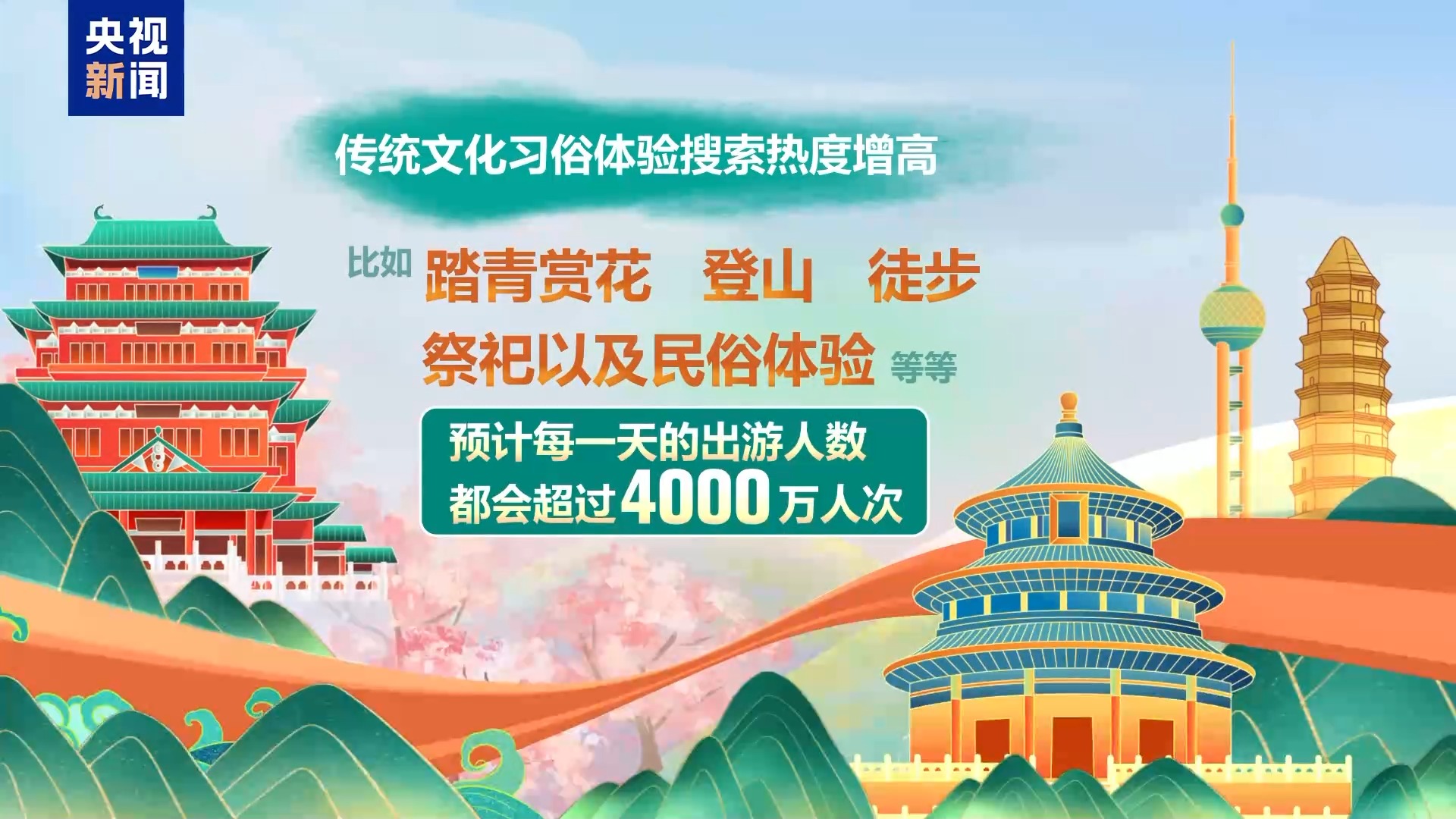 根據中國旅遊研究院的數據,這個清明節假期,居民出遊意願達到74%,傳統文化習俗體驗搜索熱度增高,比如踏青賞花、登山、徒步、祭祀以及民俗體驗等,預計每一天的出遊人數都會超過4000萬人次。
