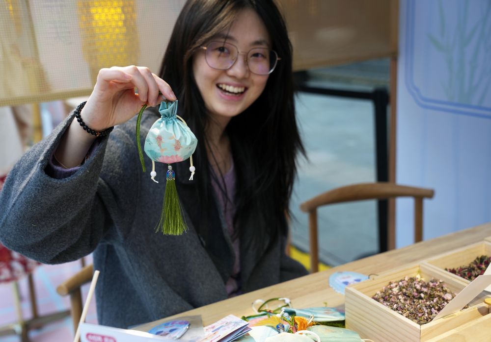2025年3月20日,遊客在上海豫園商城的國潮市集上體驗手作香囊。新華社記者 劉穎 攝