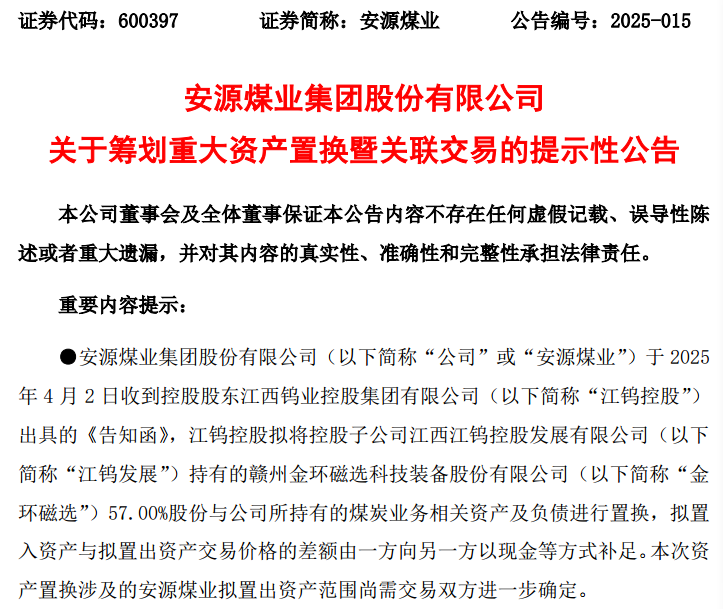 【環球網財經綜合報道】4月3日,安源煤業(600397)發佈公告,宣佈了一項重大資產重組計劃。公司擬將控股股東江西鎢業控股集團有限公司旗下控股子公司江鎢發展持有的贛州金環磁選科技裝備股份有限公司57%的股份,與公司持有的煤炭業務相關資產及負債進行置換。