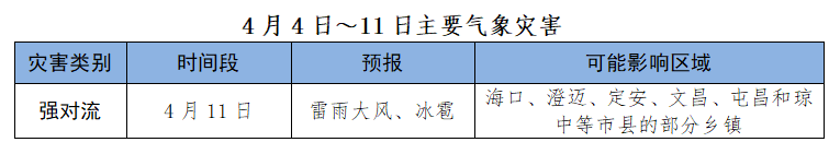 (二)11日,海口、澄邁、定安、文昌、屯昌和瓊中等市縣的部分鄉鎮將伴有雷雨大風、冰雹等強對流天氣,6日~11日部分海域雷雨時有7~8陣風,户外作業人員需及時關注氣象災害預警信號,做好防禦工作。