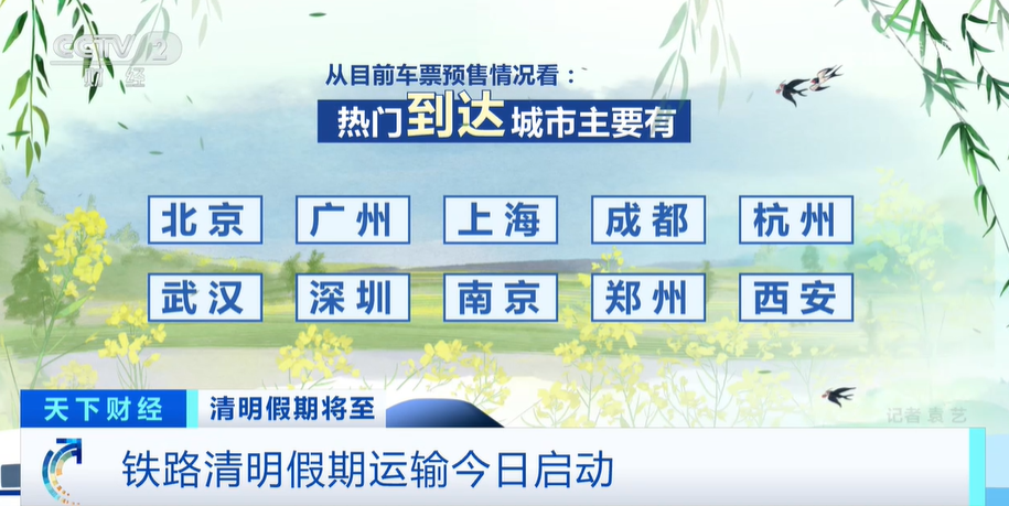 *央視網消息:*明天(4月4日)就是清明假期了,交通運輸部預計,清明假期期間,全社會跨區域人員流動量將達7.6億人次。記者從國鐵集團瞭解到,鐵路清明假期運輸今天啓動,到4月7日為期5天,全國鐵路預計發送旅客8450萬人次, 4月4日為客流最高峯日。截至昨天晚上8點,清明假期火車票已累計預售4300萬張。從目前車票預售情況看,熱門到達城市主要有北京、廣州、上海、成都、杭州、武漢、深圳、南京、鄭州、西安。從熱門線路來看,南寧往返廣州、武漢往返長沙、西安往返成都、北京往返上海、深圳至香港等熱門區間客流相對集中。