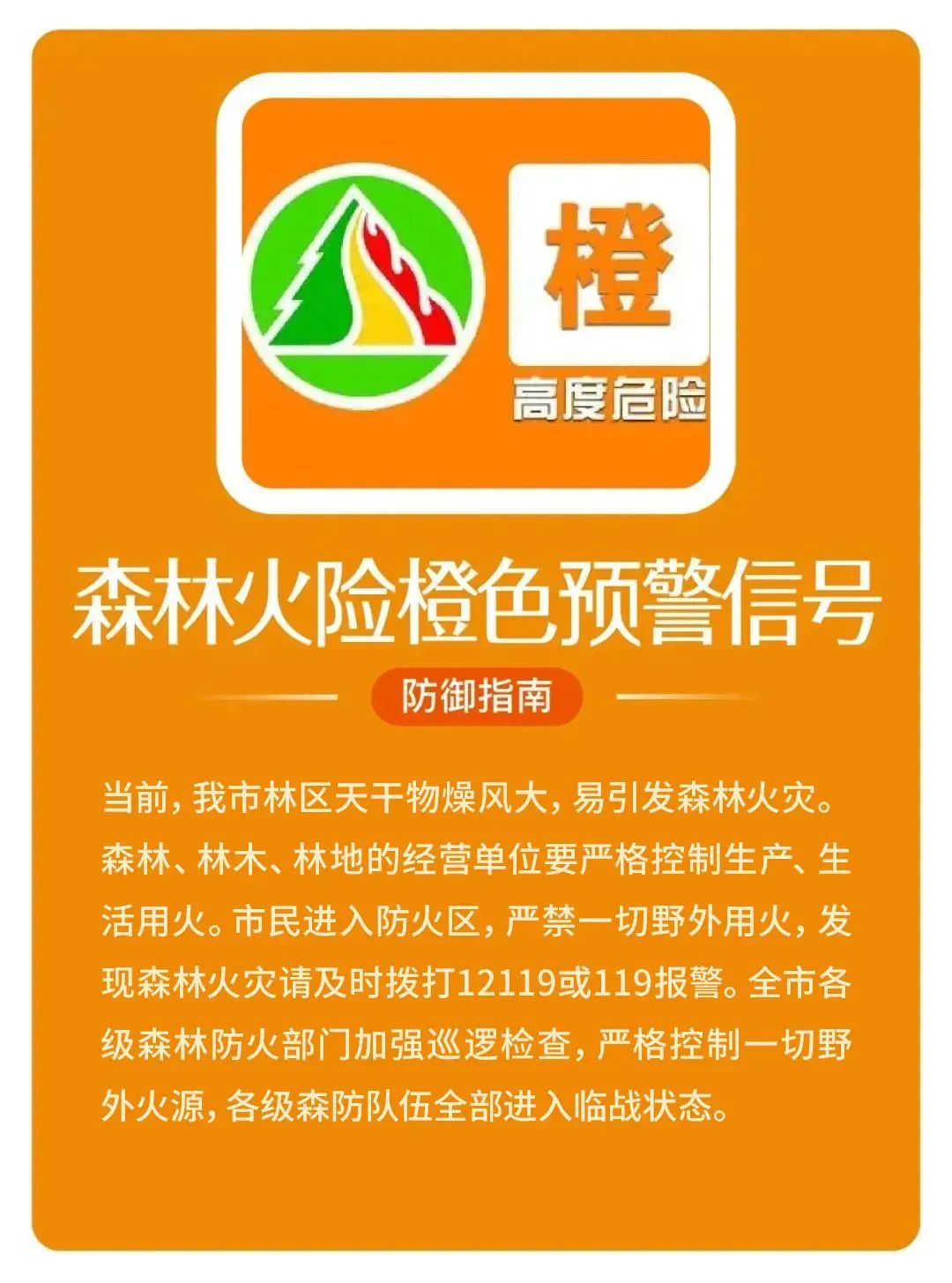 北京市森林防火指揮部辦公室發佈森林火險橙色預警:預計4月1日至6日,本市將出現大風天氣,氣象條件不利,林區植被幹燥,森林火險等級高,森林防火形勢嚴峻。嚴禁攜帶火種進山入林,嚴禁野外用火。一旦發現森林火情,請及時撥打12119或119報警。