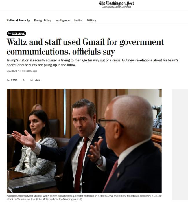 據《華盛頓郵報》1日報道,包括美國總統國家安全事務助理華爾茲在內的多名美國國家安全委員會成員,曾使用谷歌網絡郵箱個人賬户(Gmail)處理政府事務。