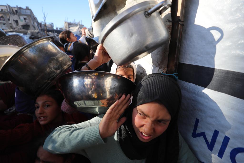 3月22日,在加沙地帶北部拜特拉希耶,人們領取救助食物。新華社發(馬哈茂德·扎基攝)
