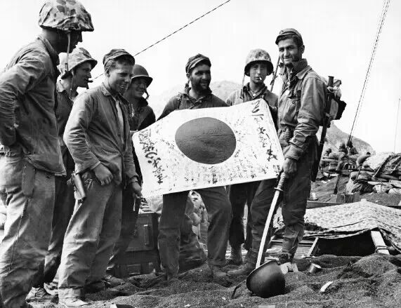 美國海軍陸戰隊展示着繳獲的日本國旗和武士刀