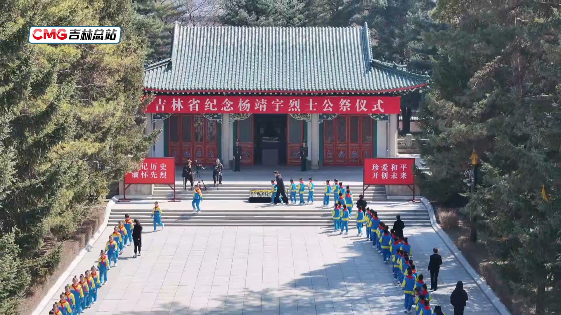 公祭儀式現場,蒼松翠柏,銅像巍立。參加公祭活動的各界羣眾莊嚴肅立,面向楊靖宇銅像默哀。少先隊員合唱《我們是共產主義接班人》,全體人員依次前往楊靖宇烈士紀念堂前,獻上鮮花,追思英烈,致敬英雄。