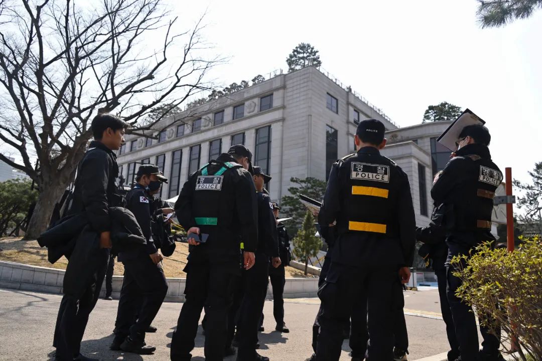 4月3日,在韓國首爾,警察在韓國憲法法院前執勤。新華社記者姚琪琳攝