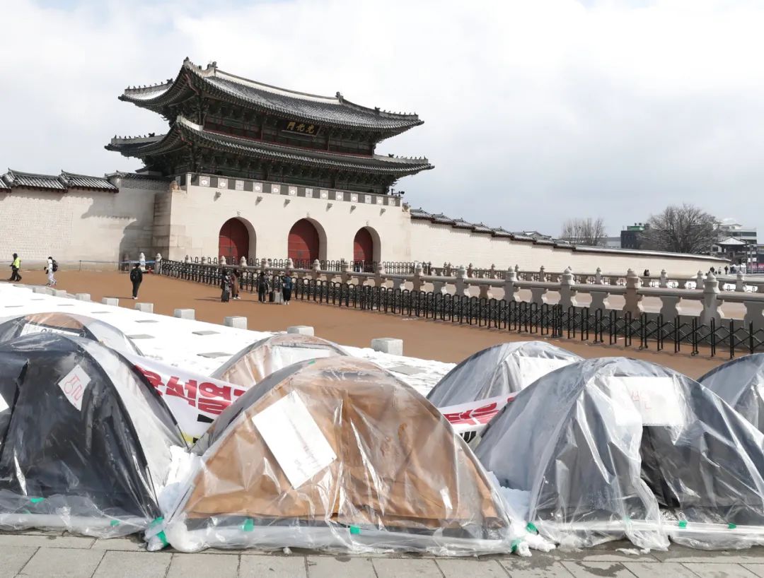 3月18日,在韓國首爾,支持彈劾尹錫悦的市民在光化門廣場前搭建帳篷,參加靜坐示威要求罷免尹錫悦。新華社記者姚琪琳攝