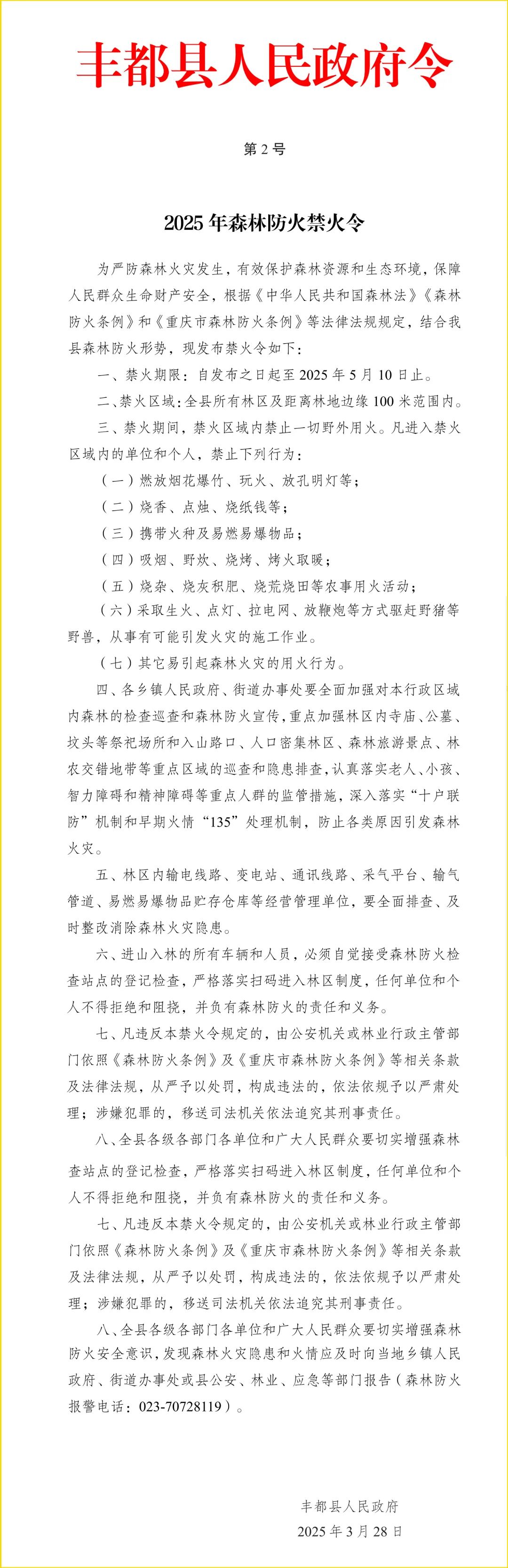 為嚴防森林火災發生,有效保護森林資源和生態環境,保障人民羣眾生命財產安全,根據《中華人民共和國森林法》《中華人民共和國治安管理處罰法》《森林防火條例》和《重慶市沙坪壩區森林火災應急預案》規定,結合我區實際,現發佈禁火令如下。