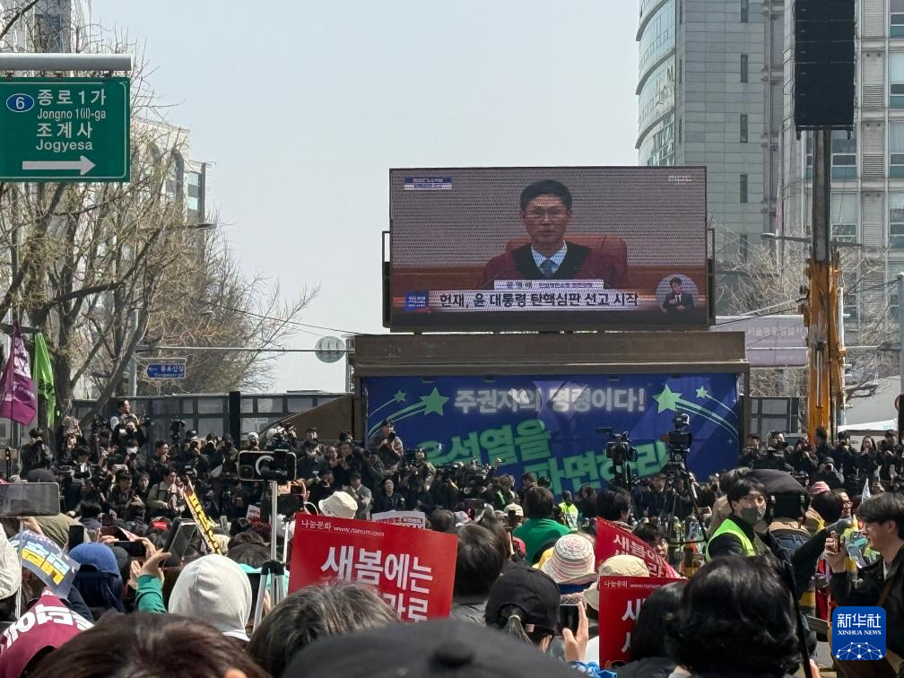 上百名警察、幾十輛警察大巴嚴陣以待,將憲法法院嚴密隔離。不遠處,在戒備森嚴的隔離帶外,大量民眾聚集在街邊,通過大屏幕收看憲法法院關於尹錫悦彈劾案的現場直播,等待即將到來的宣判。