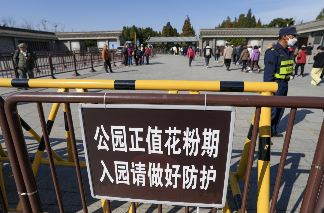 在北京天壇公園門口拍攝的花粉防護告示牌(3月21日攝)。新華社記者 鞠煥宗 攝
