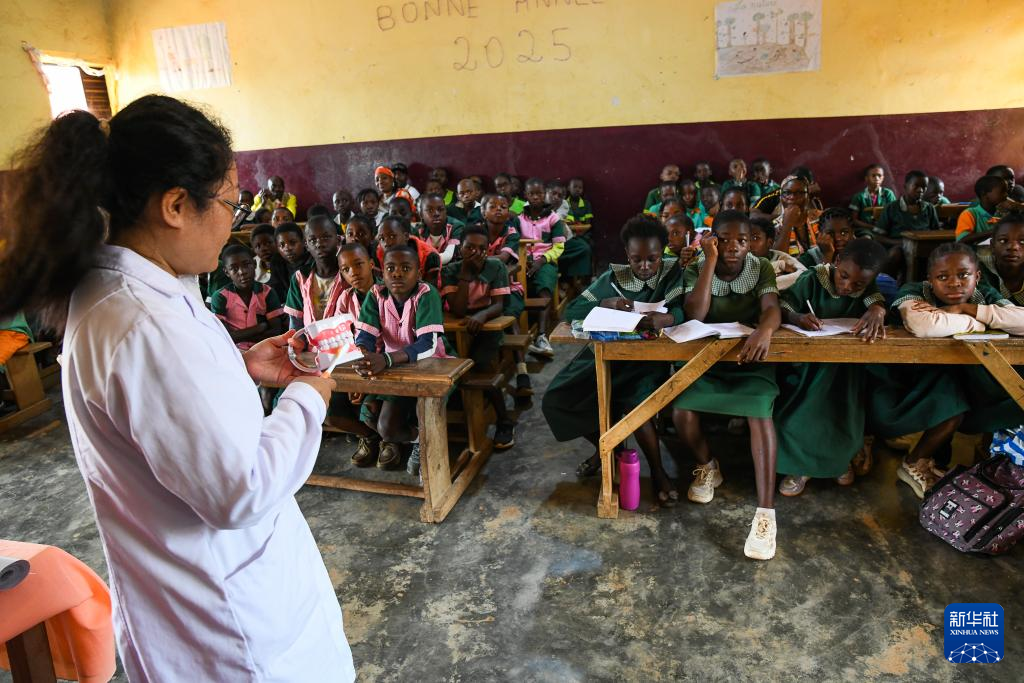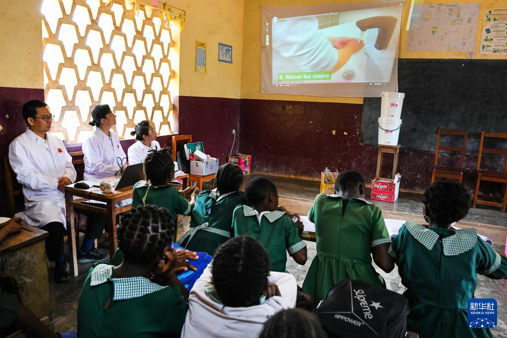 4月3日,在喀麥隆姆巴爾馬約的一所小學,中國(山西)第24批援喀麥隆醫療隊姆巴爾馬約分隊的醫生教授學生預防傳染病的方法。新華社發(科普索攝)
