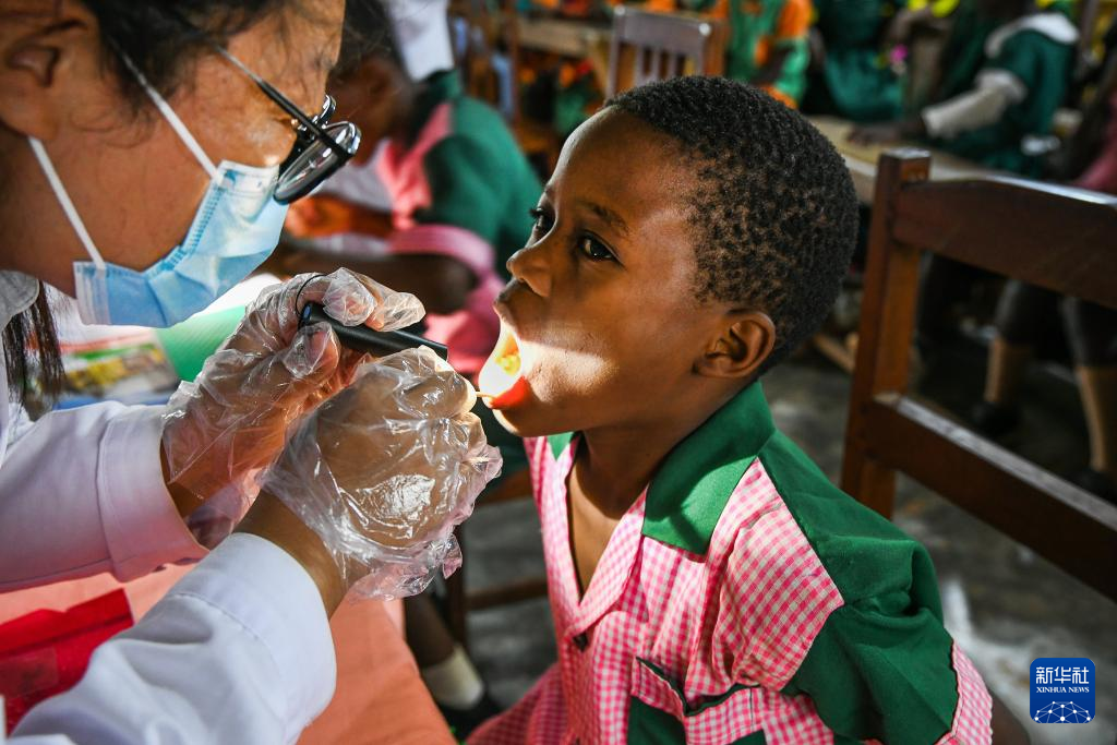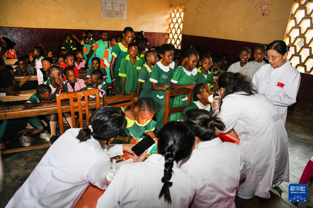 4月3日,在喀麥隆姆巴爾馬約的一所小學,中國(山西)第24批援喀麥隆醫療隊姆巴爾馬約分隊的醫生為學生進行口腔檢查。新華社發(科普索攝)