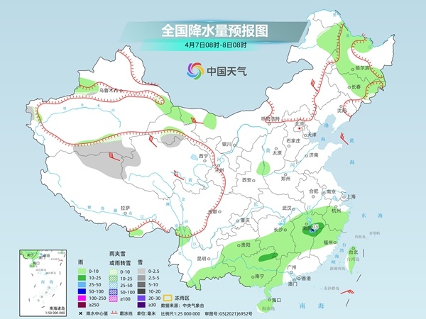 明天,內蒙古東北部、黑龍江西北部、吉林東部、新疆沿天山地區和南疆西部山區、西藏東北部、甘肅河西和南部、川西高原北部等地部分地區有小雪或雨夾雪,其中,新疆沿天山地區和南疆西部山區等地部分地區有中到大雪。黑龍江東部、吉林東部、新疆北部、西藏東南部、湖南南部和西部、四川盆地南部、貴州、雲南東部和南部、廣西、海南島北部、台灣島等地部分地區有小到中雨,局地有大雨。