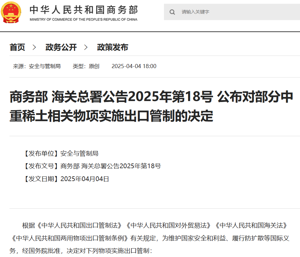 【環球網財經綜合報道】2025年4月4日,中國商務部與海關總署聯合發佈公告,宣佈對部分中重稀土相關物項實施出口管制,此舉是為維護國家安全和利益,履行國際防擴散義務。這一管制措施標誌着中國在稀土資源管理方面邁出了更加堅定的步伐。