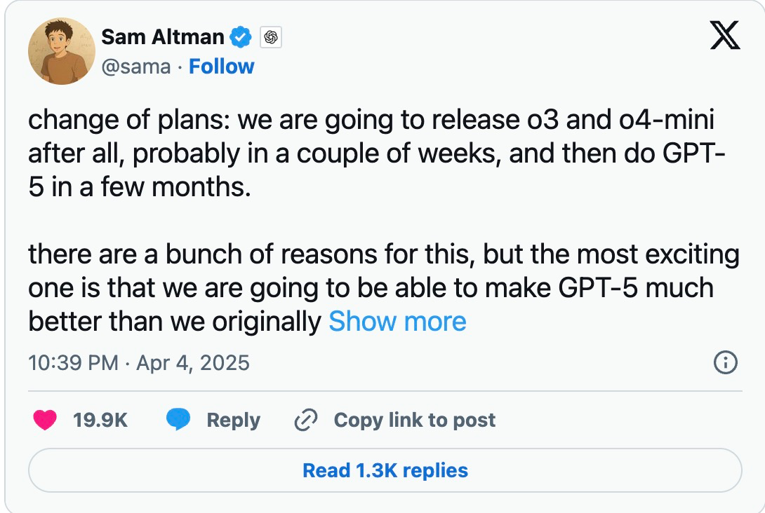 奧爾特曼在週五的 X 上寫道:“計劃改變:我們最終將發佈 o3 和 o4-mini,可能是在幾周後,然後在幾個月後推出 GPT-5。”