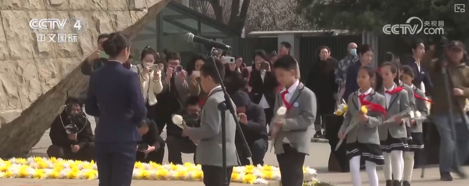 默哀結束後,人們向殘歷碑敬獻花籃,隨後參加活動的所有人員懷着崇敬之情,依次走到碑前獻上花束。在現場,青年學生、少年兒童以合唱、朗誦等形式表達對英烈的敬仰與哀思。
