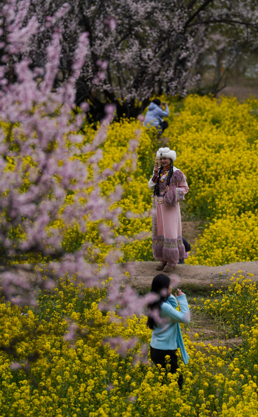 4月3日,兩名遊客身着民族服飾在林芝市巴宜區朵當村拍照。新華社記者 晉美多吉 攝