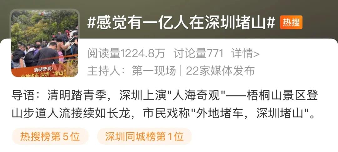 4月4日,清明小長假首日,深圳各大景區迎來客流高峯,梧桐山、馬巒山、筆架山等登山熱門地及大梅沙海濱公園,均出現遊客擁堵現象,網友評論:“感覺景區像有1億人!”