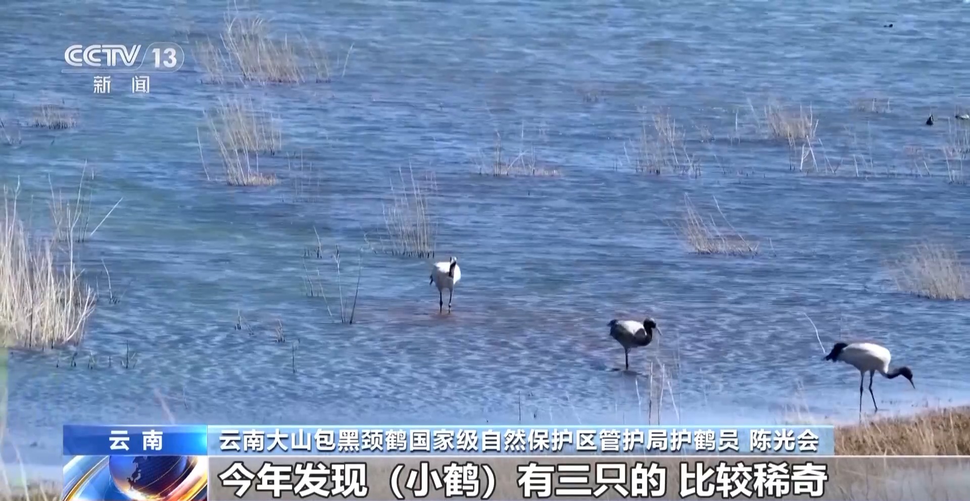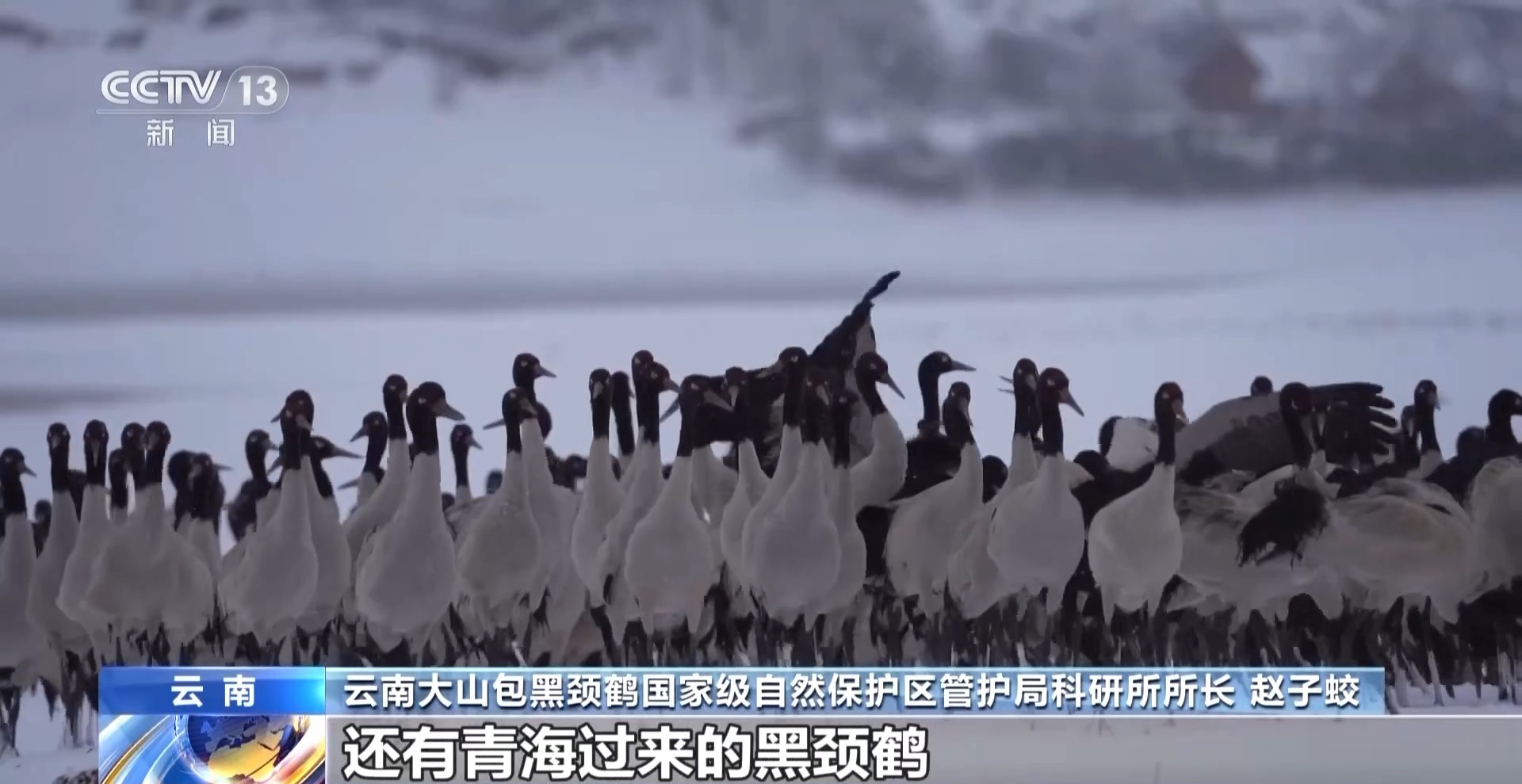 *雲南大山包黑頸鶴國家級自然保護區管護局科研所所長 趙子蛟:*我們也監測到了從甘肅尕海過來的,還有青海過來的黑頸鶴。相當於東部種羣傳統繁殖地,更往北的一些地區黑頸鶴也跑到大山包來越冬,也是一個新的發現。