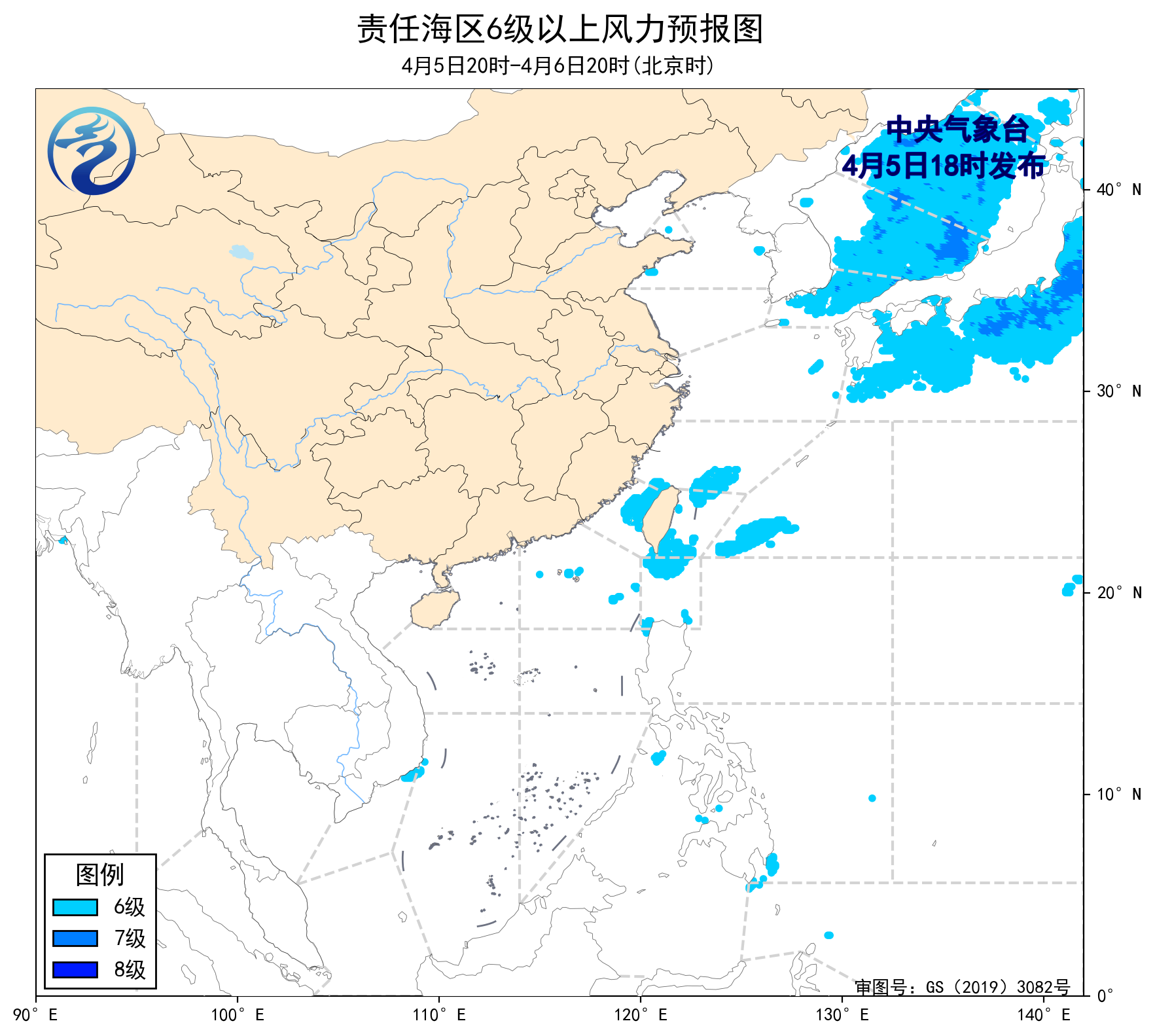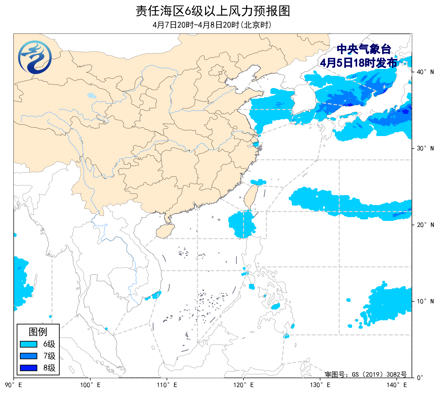 4月8日夜間至12日白天,渤海、渤海海峽、黃海大部海域、東海大部海域、台灣以東洋麪、巴士海峽、南海東北部海域將有5~7級、陣風8級的大風,其中東海南部部分海域風力可達8~9級、陣風10級。