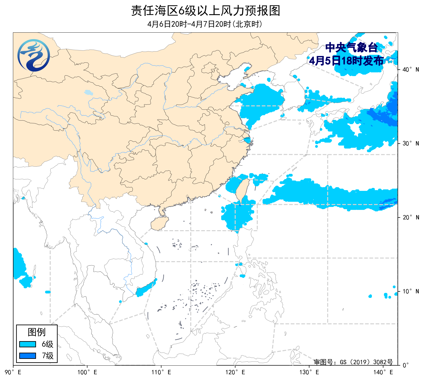 6日20時至7日20時,黃海北部海域將有4級以下增大到5~6級、陣風7級的東南風轉西南風,黃海中部和南部海域將有4~6級、陣風7級的偏南到西南風,台灣海峽、巴士海峽將有5~6級、陣風7級的偏北到東北風,台灣以東洋麪、南海東北部海域將有4~6級、陣風7級的東北風到偏東風。