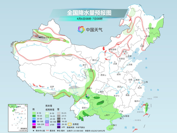 中央氣象台預計,今天,新疆沿天山高海拔地區和南疆盆地西部山區、內蒙古東北部、吉林東部、西藏東部和南部、青海東部、甘肅河西、川西高原中南部等地部分地區有小到中雪或雨夾雪,局地有大雪。東北地區東部、西藏東南部、四川盆地中部、貴州、雲南東部和南部以及江南西部、華南西部、海南島、台灣島大部等地部分地區有小到中雨,局地有大雨。