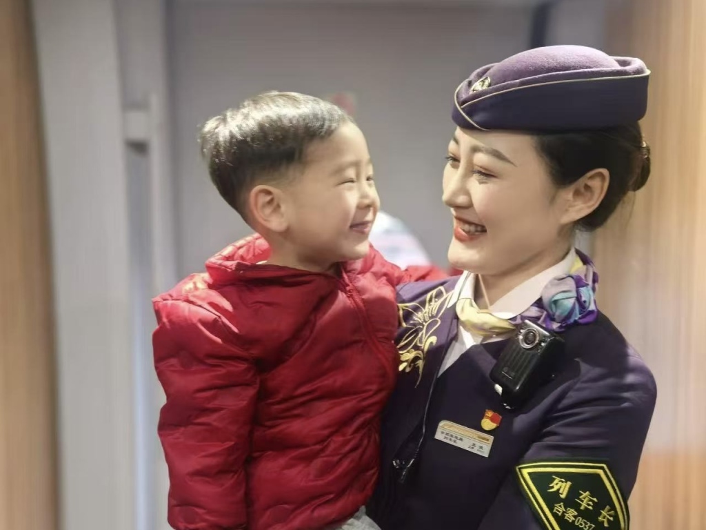 G649次列車長幫助旅客照看兒童。葉聖舒 攝