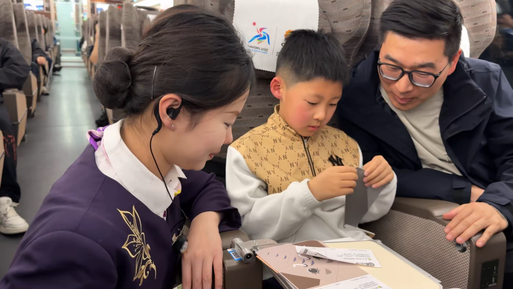列車工作人員為兒童旅客提供摺紙。姚佳 供圖