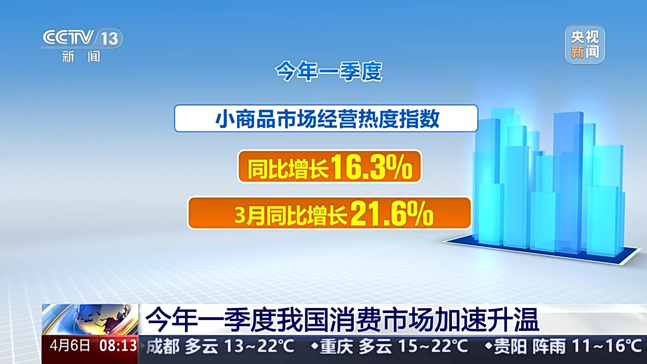 小商品市場經營熱度指數一季度同比增長16.3%,其中3月同比增長21.6%,這表明與居民生活貼近的小商品銷售持續保持旺盛活力,民生消費需求正在加速釋放。