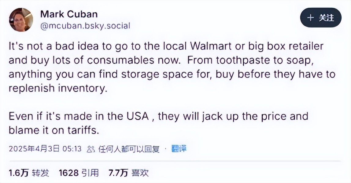 4月2日下午,馬克·庫班在社交平台再次呼籲囤貨,稱“從牙膏到肥皂,凡是能找到地方儲存的東西,都應該趁早買起來,最好是在商店補貨前購買”。他指出,即使是美國製造的商品,也有可能漲價,“他們會歸咎於關税”。