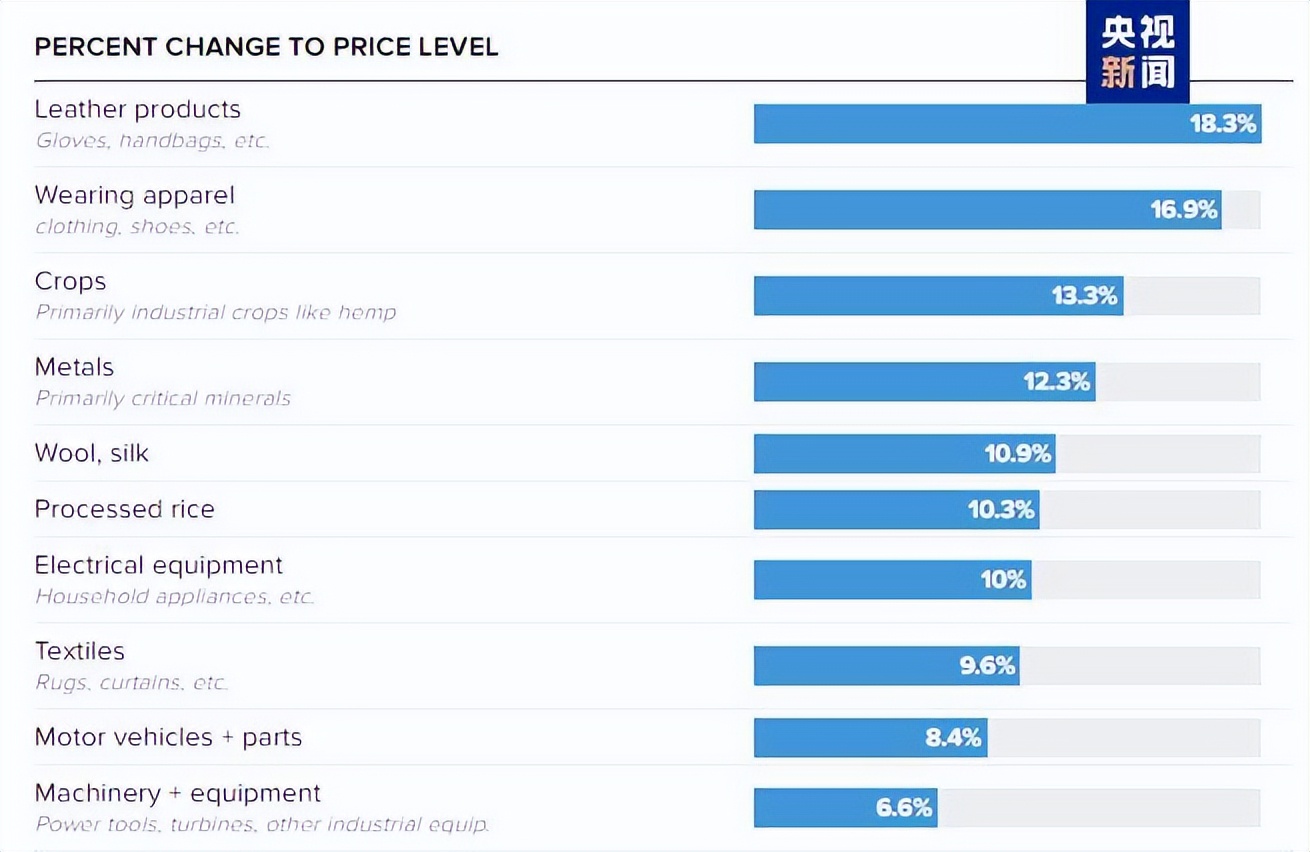 關税政策不僅引發消費者恐慌,也對美國經濟造成衝擊。耶魯大學預算實驗室預測,皮革製品、衣服、農作物、金屬、羊毛等類別產品價格漲幅將超過10%。此外,關税政策還將導致聯邦税收增加2584億美元,佔GDP的0.85%,美國個人税後收入平均減少1.9%,普通家庭平均每年增加1900美元的税收負擔。