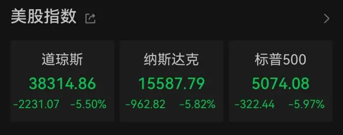 北京時間4月5日凌晨,美股週五收盤後連續第二日重挫,上演“黑色星期五”。三大股指跌幅均超5.5%。道指跌2231.07點,跌幅為5.50%;納指跌962.82點,跌幅為5.82%;標普500指數跌322.44點,跌幅為5.97%。