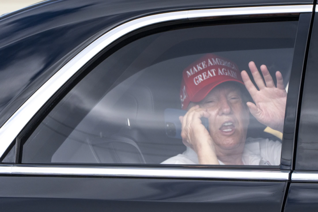 4月4日,特朗普在抵達位於佛羅里達州的特朗普國際高爾夫俱樂部時向圍觀者揮手致意。圖源:外媒