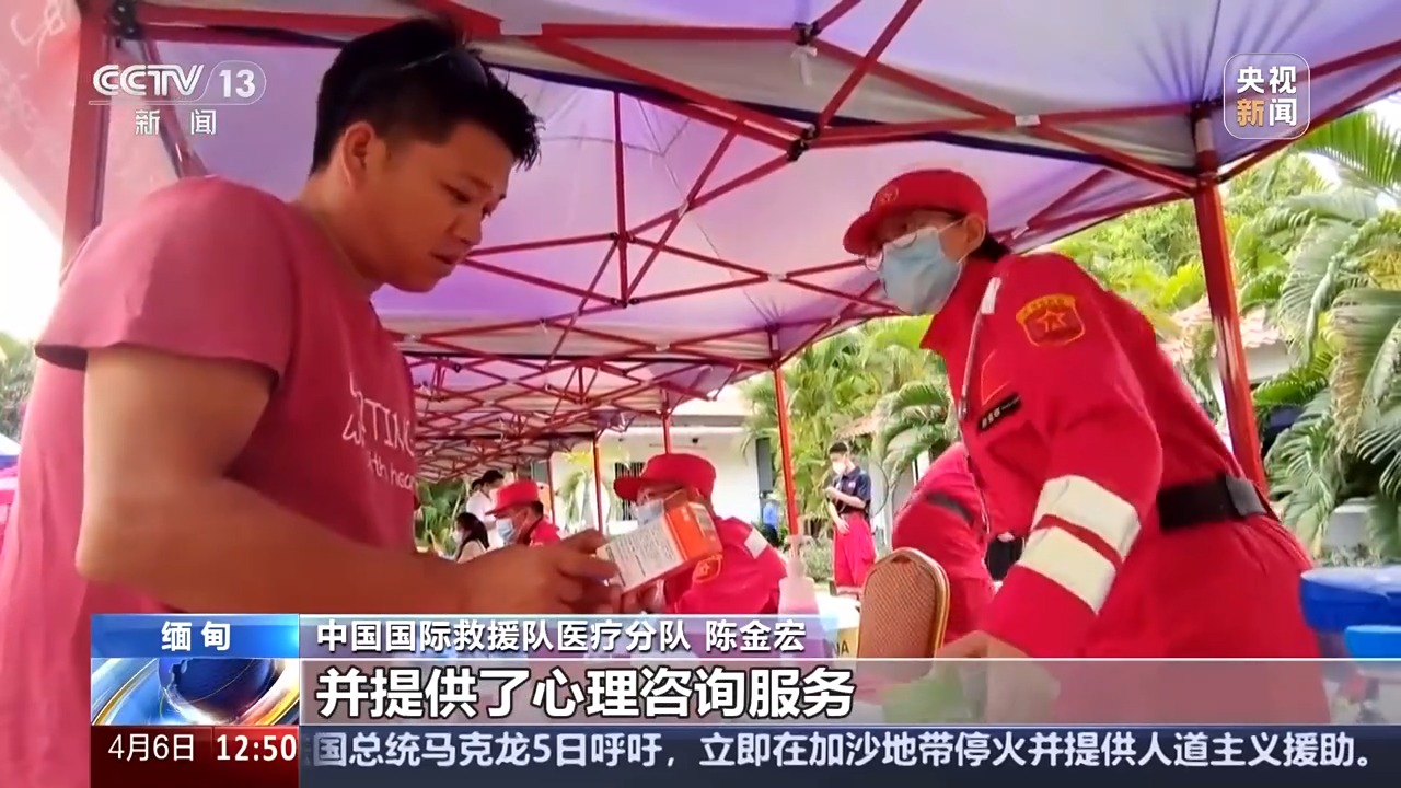 *總枱央視記者 唐國榮:*這裏是緬甸曼德勒的多金堰地區,來自中國救援隊、中國國際救援隊和中國香港救援隊的醫療隊員們,來到這裏為緬甸地震中受災的人員開展各種醫療救助服務。