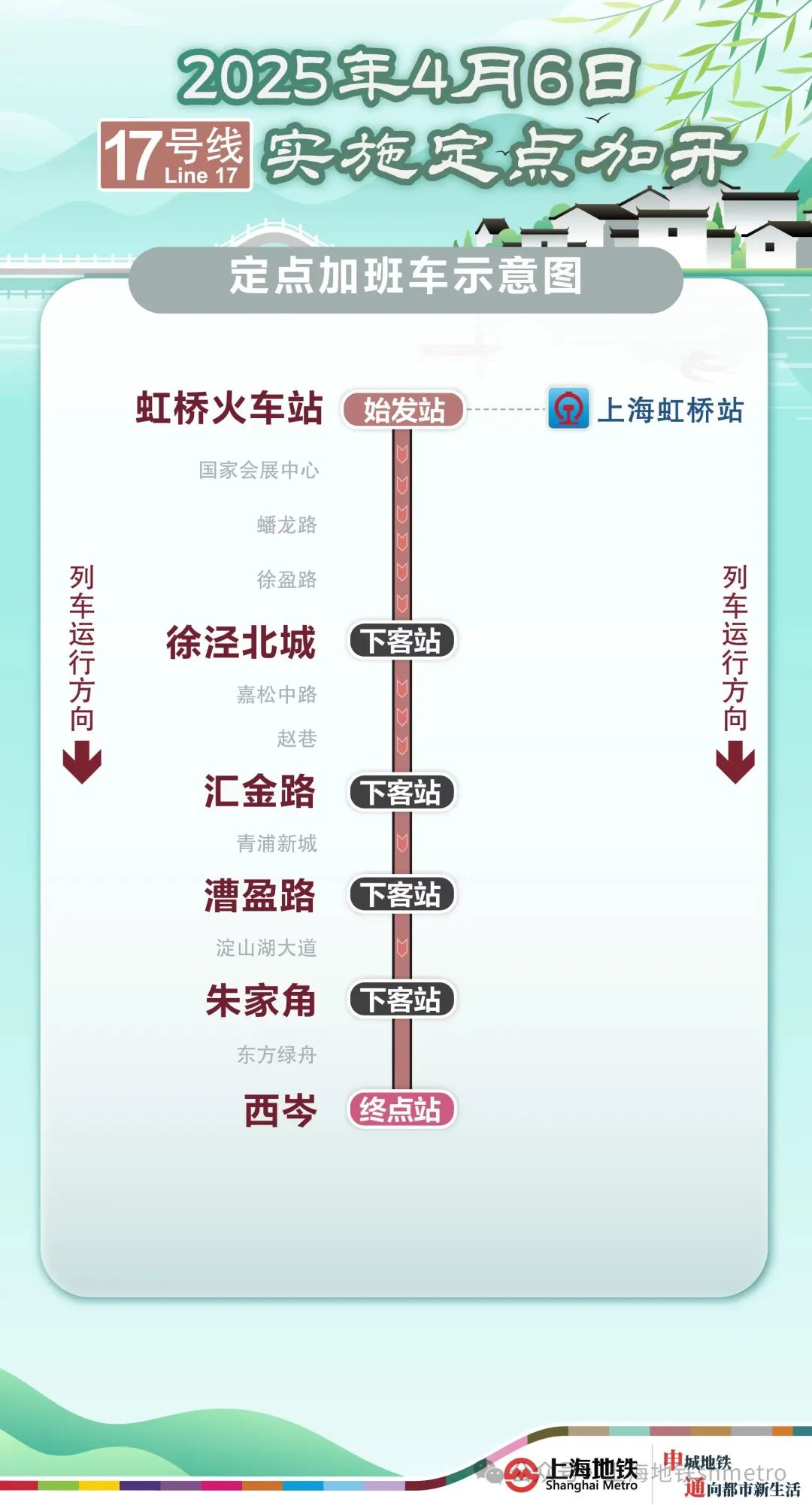 17號線在虹橋火車站站下行末班車(23:00)後加開4班定點加班車。加班車沿途停靠虹橋火車站站、徐涇北城站、匯金路站、漕盈路站、朱家角站、西岑站(終點站),其餘車站不停靠。停靠車站中,虹橋火車站站(始發站)可上客,其餘車站只下不上。