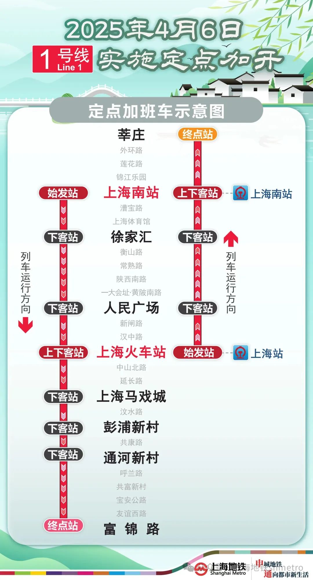 在上海南站站末班車(22:42)後加開4列定點加班車運行至富錦路站,加班車停靠上海南站站、徐家彙站、人民廣場站、上海火車站站、上海馬戲城站、彭浦新村站、通河新村站、富錦路站(終點站),其餘車站不停靠。停靠車站中,上海南站站(始發站)、上海火車站站可上下客,其餘車站只下不上。
